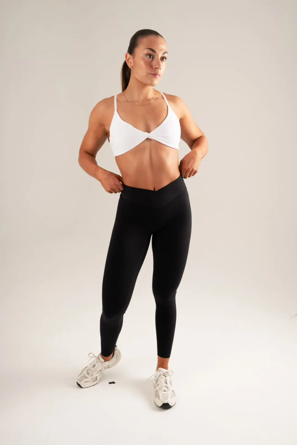 Størrelse:Modellen her har S, høyde 171 cm, og S i overdel. Er du mellom størrelser i tights kan du gå for den minste i denne modellen, kan oppleves litt stor – midjebåndet på tightsen er videre/bredere – enn på yoga pants, som har smalere midje seksjon. Ønsker du modell lik yoga pant velg opule shape tights.